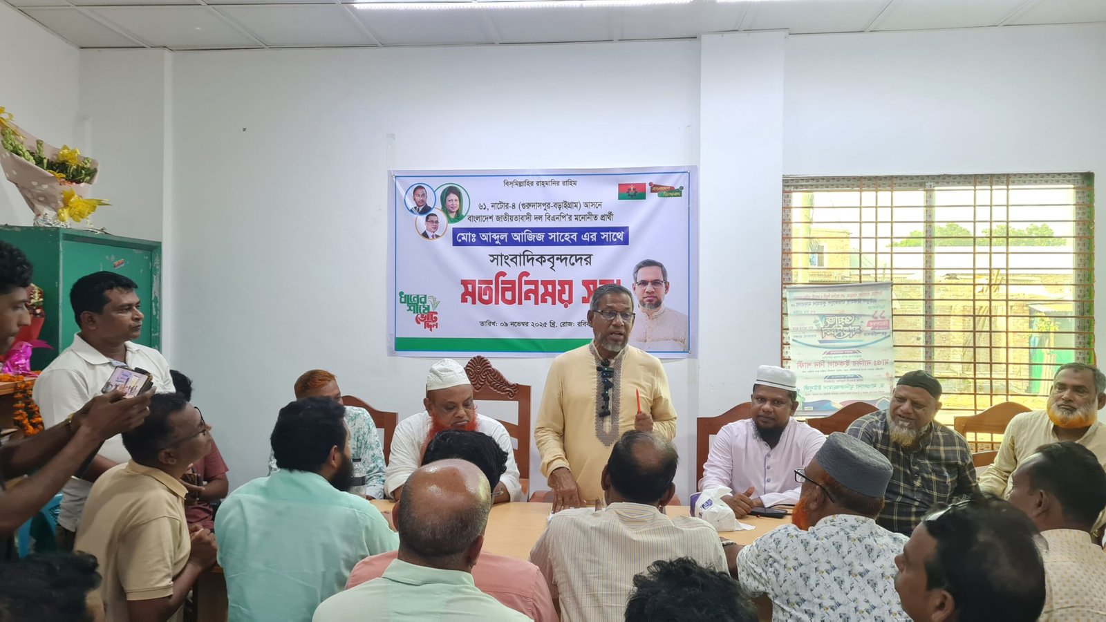 নাটোর-৪ (গুরুদাসপুর-বড়াইগ্রাম) আসনের বিএনপি মনোনিত ধানের শীষের প্রার্থী মো. আব্দুল আজিজ স্থানীয় গণমাধ্যম কর্মীদের সাথে মতবিনিময় সভা করেছেন। রোববার দুপুরে উপজেলার ধারাবারিষা ইউনিয়ন বিএনপির কার্যালয়ে ওই সভা করেন।