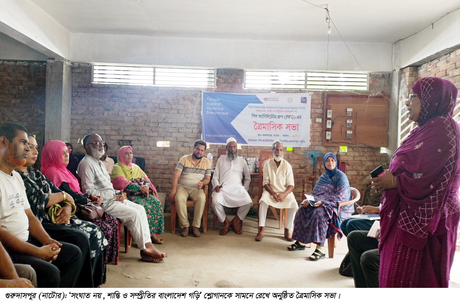 ‘সংঘাত নয়, শান্তি ও সম্প্রীতির বাংলাদেশ গড়ি’ শ্লোগানকে সামনে রেখে গুরুদাসপুরে হাঙ্গার প্রজেক্টের ‘পিস ফ্যাসিলিটেটর গ্রæপ’ (পিএফজি) এর ত্রৈমাসিক সভা অনুষ্ঠিত হয়েছে। মঙ্গলবার বেলা ১১টায় পৌর সদরের অস্থায়ী কার্যালয়ে পিএফজি’র অ্যাম্বাসেডর অধ্যাপক জয়নাল আবেদীনের সভাপতিত্বে ওই সভা হয়।